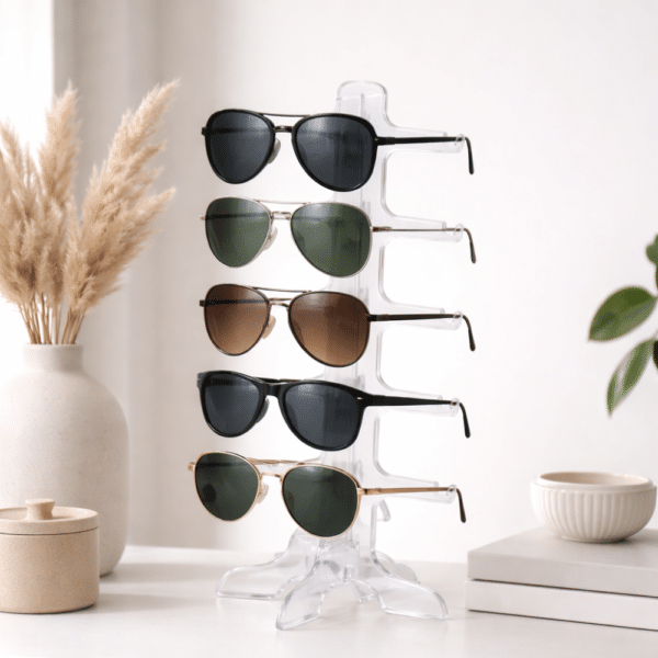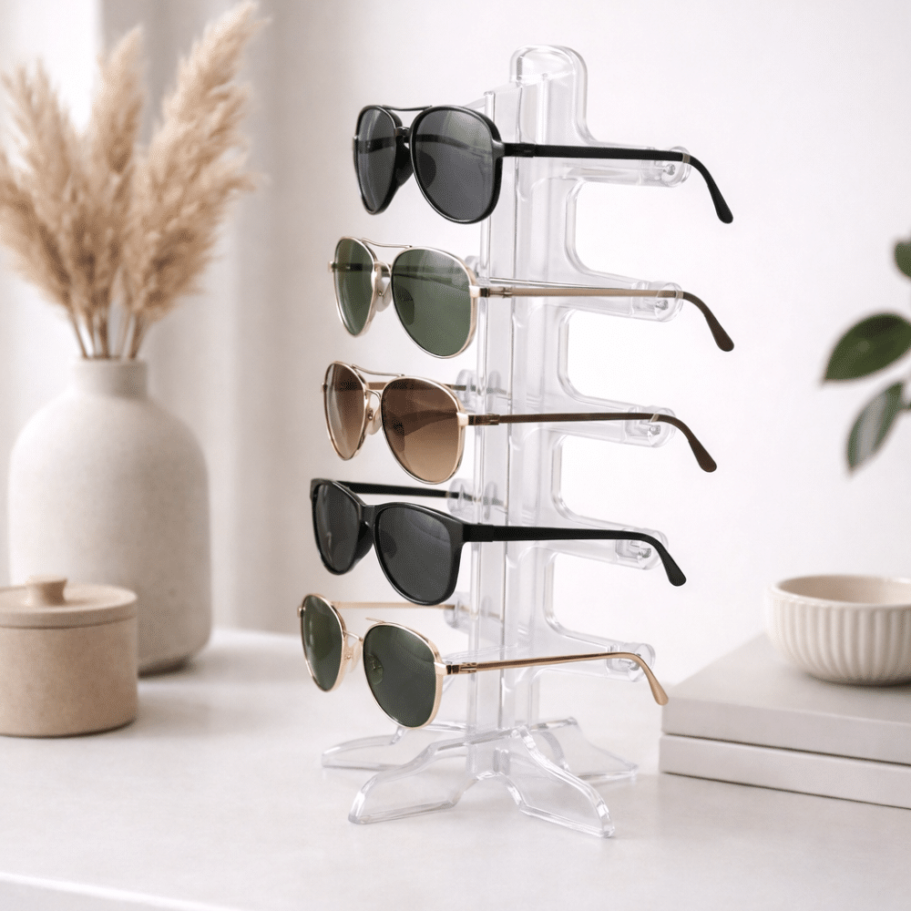 Denne brilledisplay i akryl kombinerer funktionalitet, holdbarhed og stilfuldt design – så dine briller altid præsenteres på bedst mulig måde.