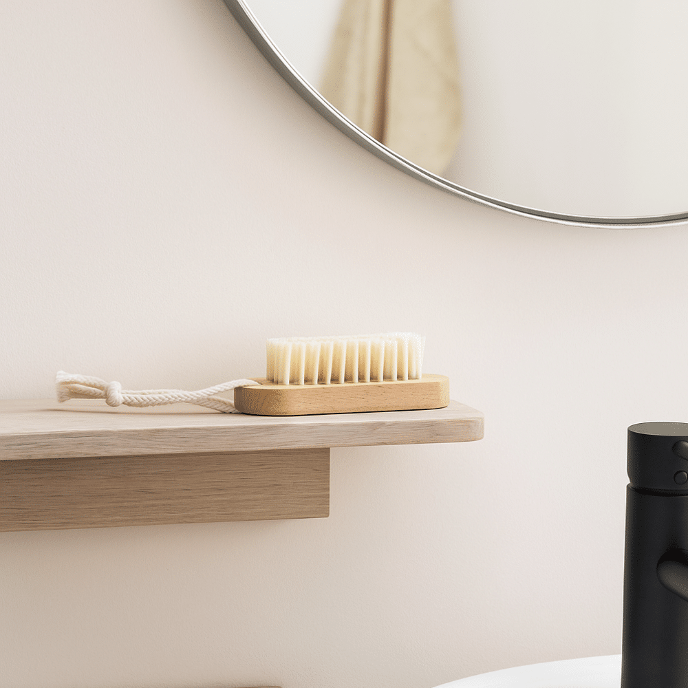 Et minimalistisk badeværelse får karakter, når der tilføjes elementer af naturligt træ. Denne neglebørste er både et praktisk redskab og et lille designobjekt, der tilfører varme til rummet. Den glatte overflade og det fine træmønster skaber en rolig kontrast til hvide håndvaske og lyse klinker. Hæng den op ved siden af håndklædet, læg den på en lille træbakke eller kombiner den med andre plejeprodukter i naturmaterialer for et gennemført look.