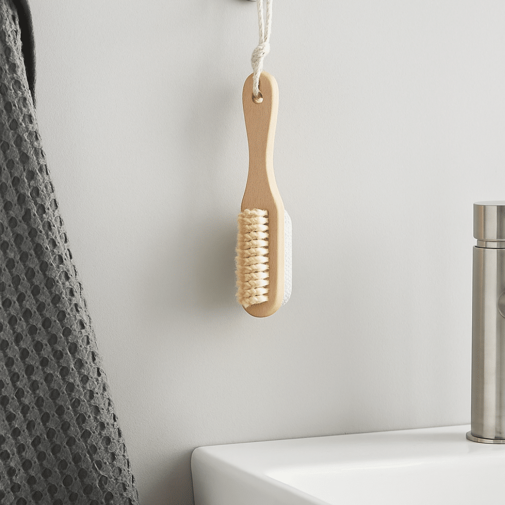 Denne dobbeltsidede neglebørste kombinerer en tæt række af faste børstehår på den ene side og en effektiv pimpsten på den anden. Kombinationen gør det muligt både at rense negle og hud grundigt samt at fjerne hård hud og ru områder. Med sit slanke træhåndtag ligger børsten godt i hånden og gør den nem at bruge, både i badet og ved håndvasken.