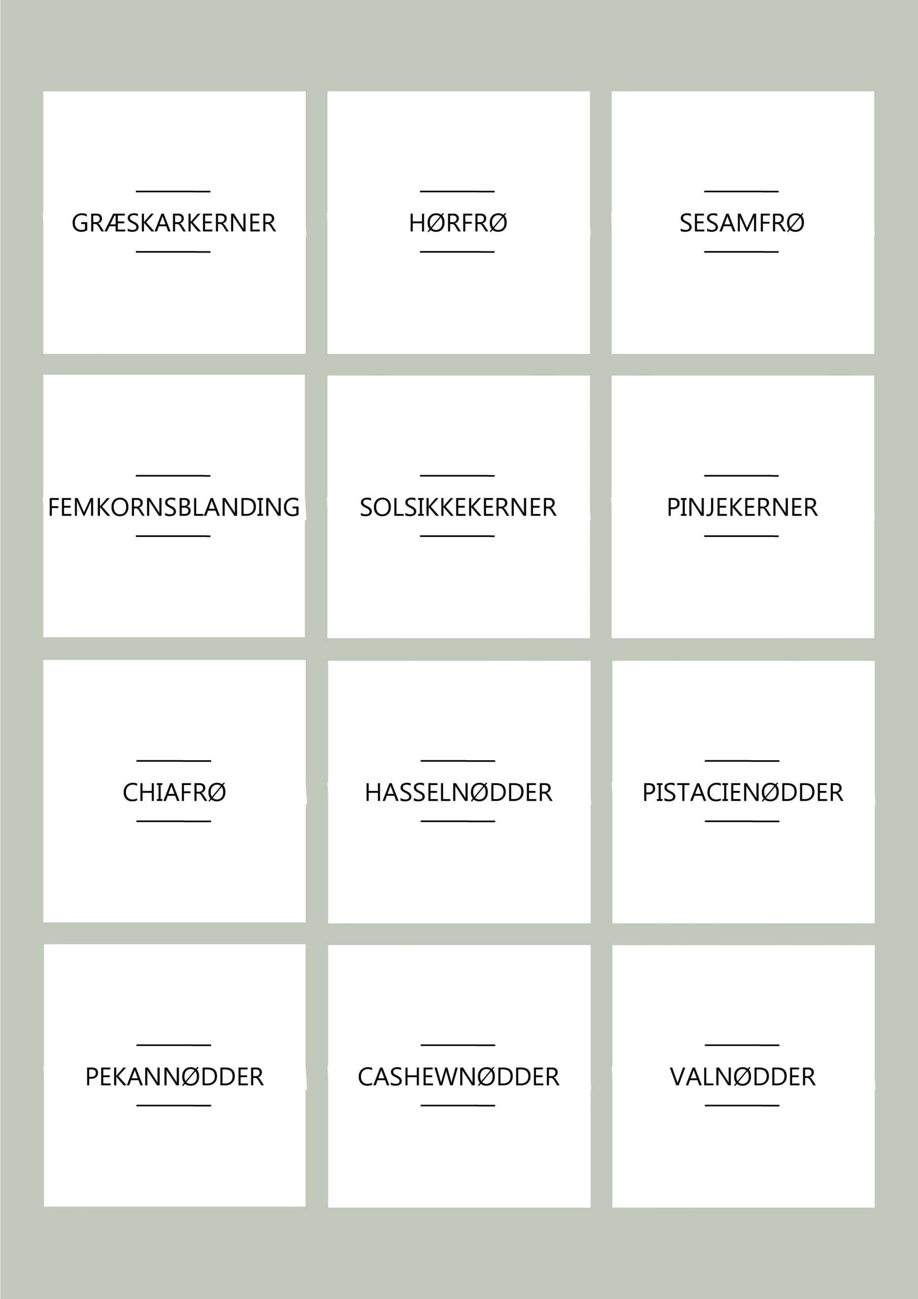 Vi har gjort det nemt for dig at holde styr på dine madvarer ved at inkludere etiketter til de mest anvendte nødder og frø: