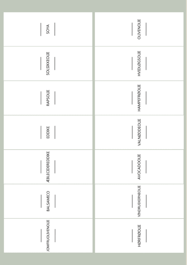 ✔ Komplet sæt: 28 etiketter, der dækker et bredere udvalg af olie- og eddikevarianter