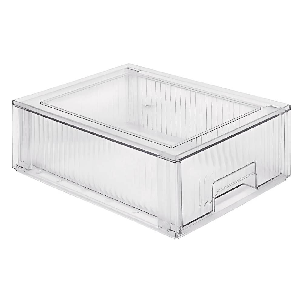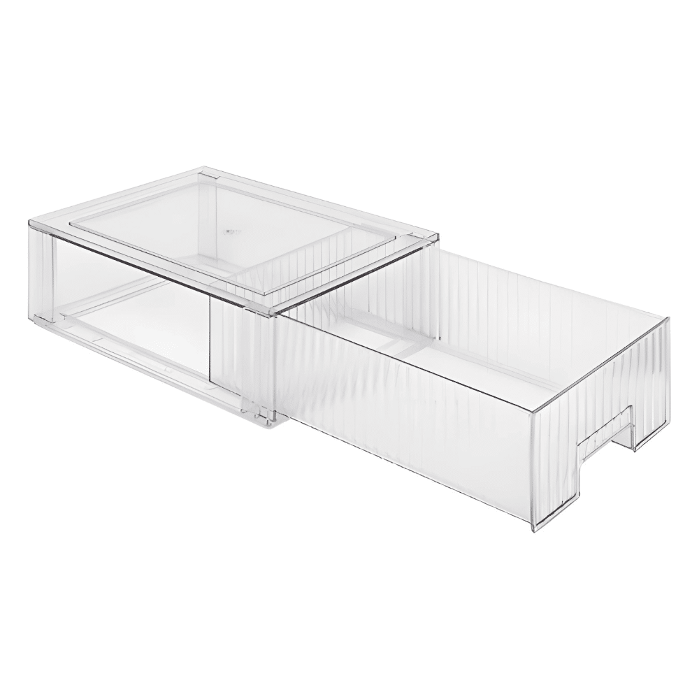 Den gennemsigtige plast gør det muligt at se indholdet med det samme, hvilket er praktisk, når du har travlt om morgenen. Samtidig holder skuffen dine ting fri for støv og fugt, så de holder sig pæne længere.