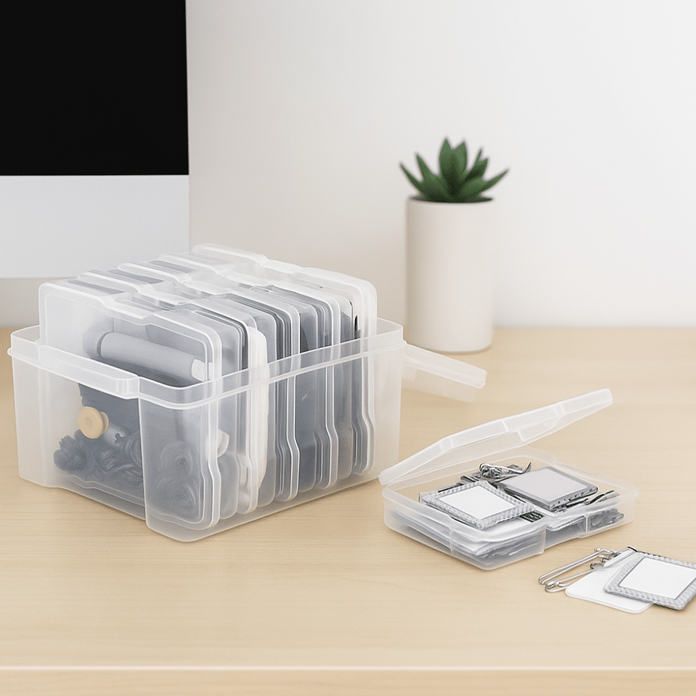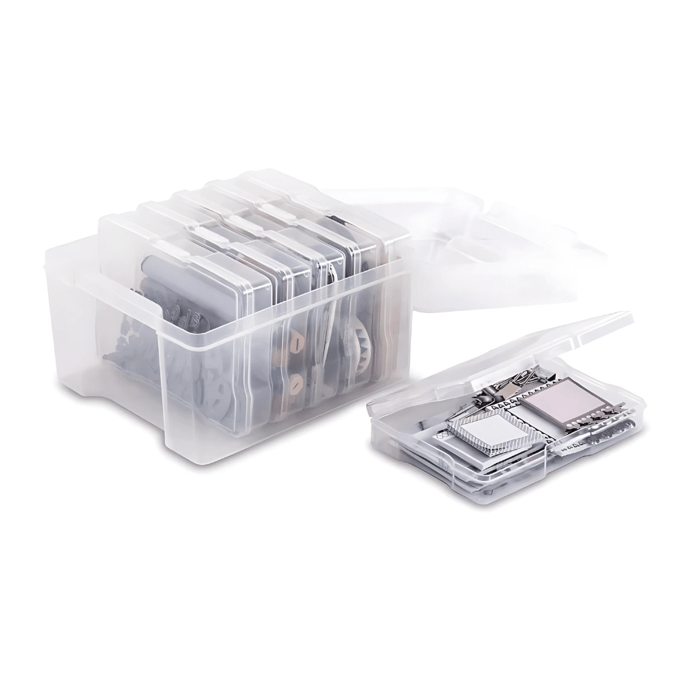 Denne smarte kasse med små kasser måler 215 x 140 x 185 mm og indeholder seks separate indre bokse, der hver især kan bruges individuelt eller samlet i den medfølgende hovedkasse. De små æsker passer perfekt ned i den ydre boks, og den gennemsigtige plast gør det let at identificere indholdet med det samme – uden at åbne hver enkelt æske.