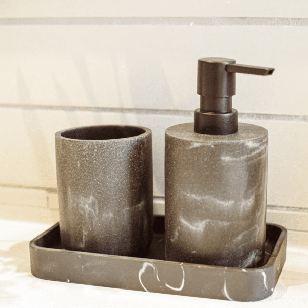Den sorte resin med sine subtile marmoreringer passer perfekt til både moderne, industrielle og klassiske badeværelser. Sættet skaber en følelse af luksus og orden, uanset hvordan du vælger at bruge det.