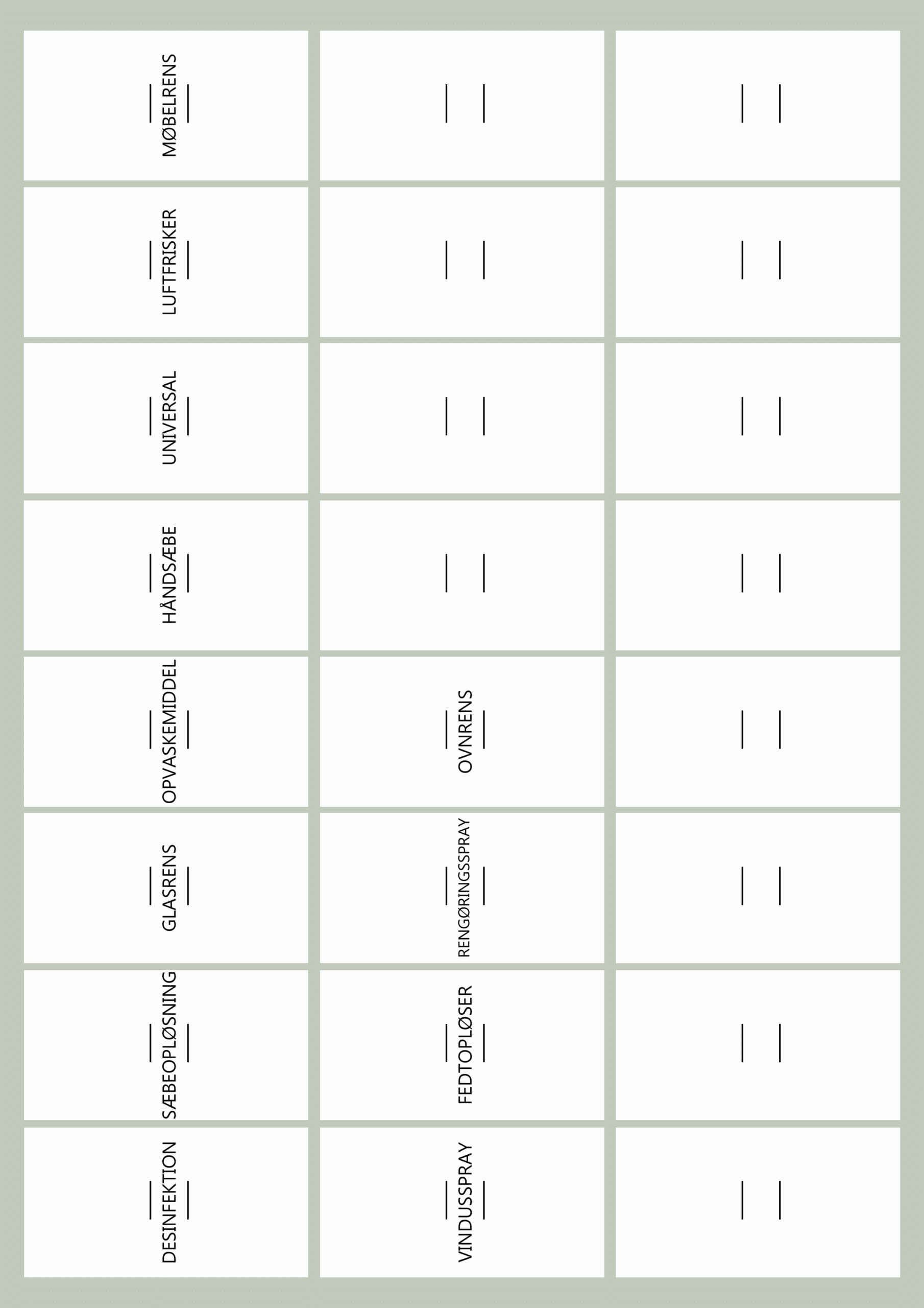 ✔ Universelle rengøringsmidler – Hold styr på forskellige produkter som glasrens, kalkfjerner, opvaskemiddel m.m.