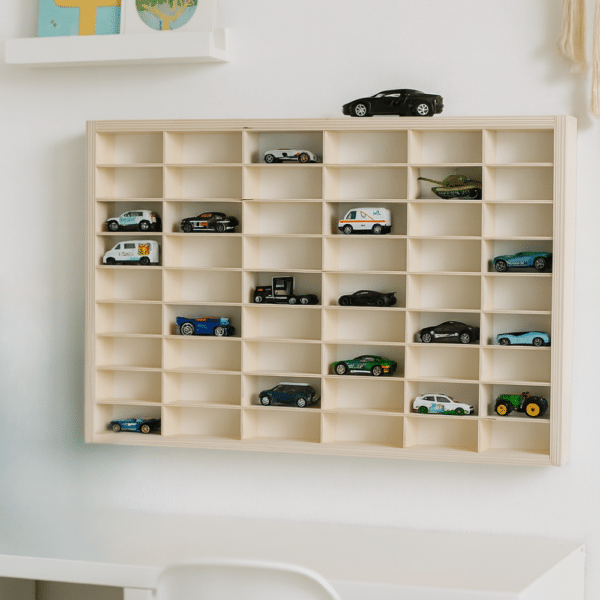 Sættekassen er ideel som hylde til biler, hvor børn kan opbevare deres legetøjsbiler, hot wheels, figurer eller LEGO-mænd. Med dens mange små rum kan børn nemt finde deres yndlingslegetøj, når legen kalder. Den giver også et sjovt og dekorativt touch til børneværelset, hvor opbevaring og leg går hånd i hånd. Bemærk, at rummene ikke sidder stramt fast i siderne, så det kan forekomme, at de hænger en smule – dette skyldes naturtræets naturlige bevægelser og gør hver sættekasse unik.