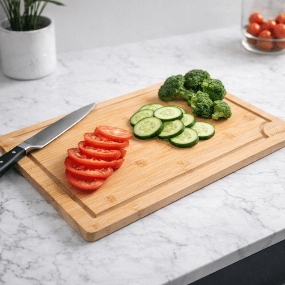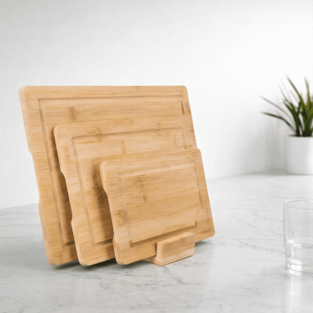 Skærebræt sæt i bambus med holder – 3 praktiske størrelser til dit køkken
