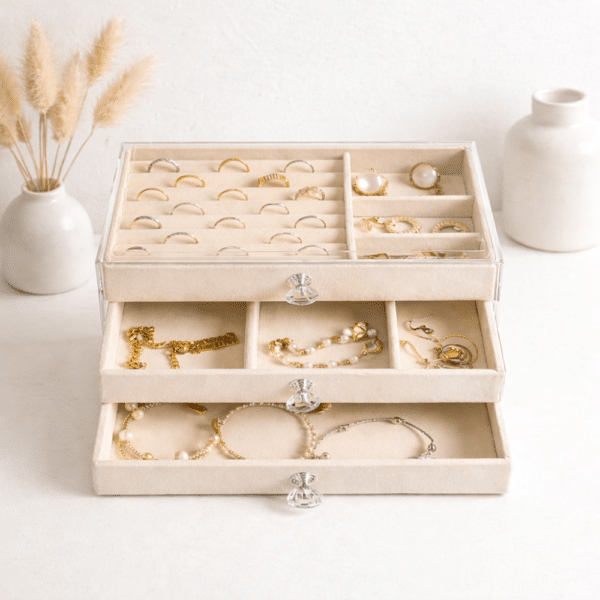 Dette smykkeskrin er lavet i klar akryl med beige detaljer, som skaber et elegant og tidløst udtryk. Akryl er et robust og let materiale, som både beskytter dine smykker mod støv og holder dem synlige og let tilgængelige. Med tre praktiske skuffer får du et overskueligt system, der gør det nemt at holde styr på smykkerne — uden sammenfiltring og rod.