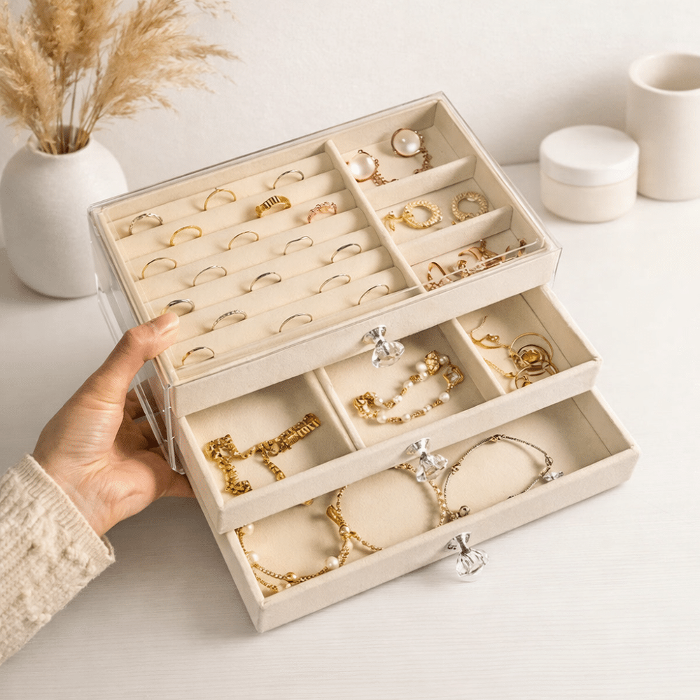 Det minimalistiske design i klar akryl og beige passer perfekt ind i både moderne, skandinaviske og klassiske boligstile. Smykkeskrinet fylder ikke meget, så det er ideelt til kommoden, badeværelset, walk‑in‑closet eller makeupbordet — et praktisk opbevaringsmøbel, der samtidig fungerer som en stilfuld detalje i din indretning.